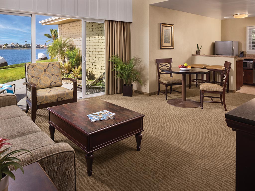 Spacious studios and one-bedroom suites provide room for families to spread out, with separate living areas that make early bedtimes for little ones (or late-night movies for teens) entirely doable. Kitchenettes in select rooms add another layer of ease – perfect for stashing yogurt cups, reheating leftovers from dinner, or keeping favorite snacks on hand. The coastal-inspired décor feels fresh yet unfussy, echoing the laid-back rhythm of Mission Bay just beyond the door.